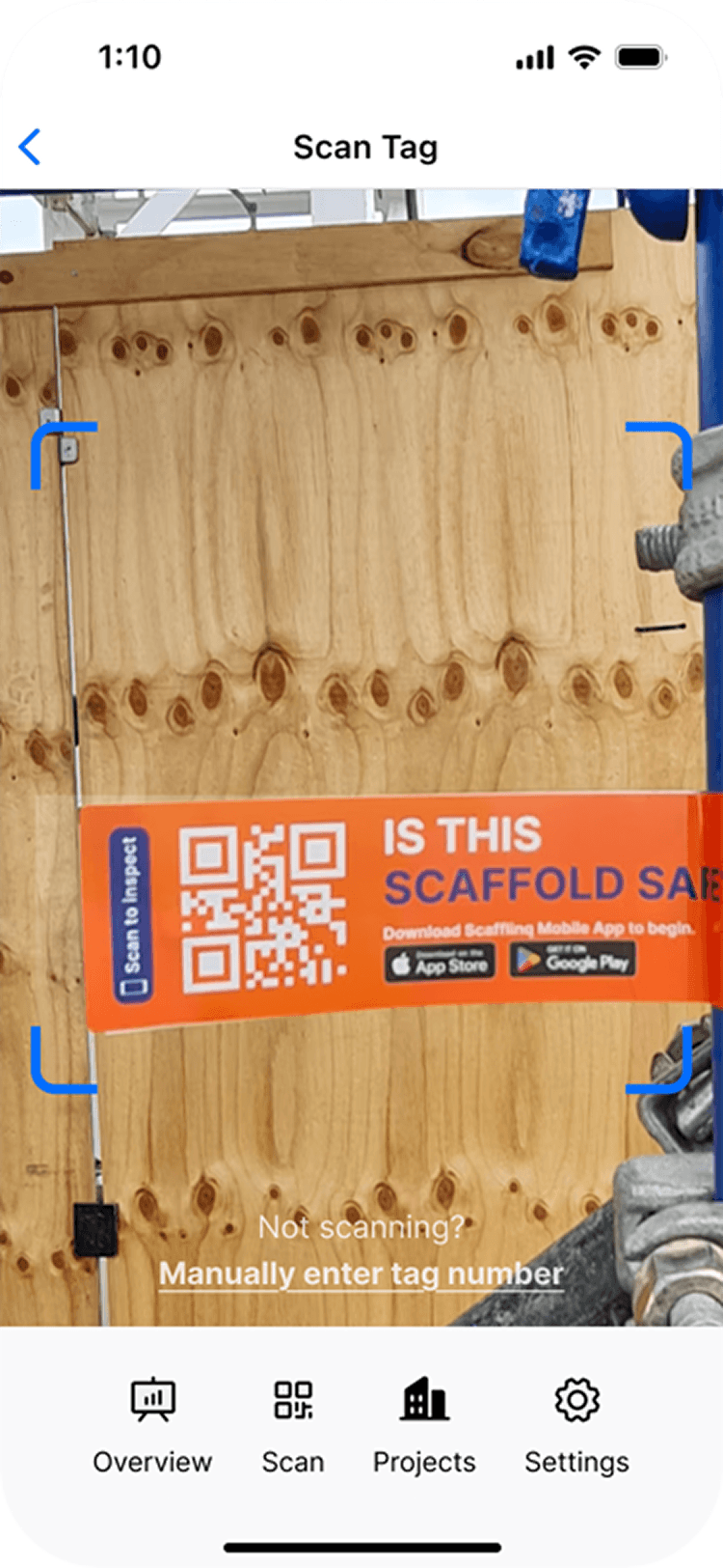 Anyone can scan to view scaffold status and last inspection details.