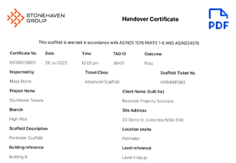 Generate and send handover certificates straight from site — with auditable records behind every scaffold.